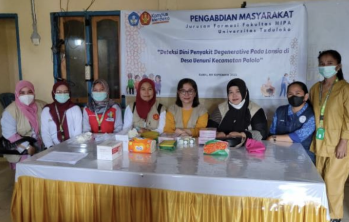 Tim dosen dari Program Studi Farmasi Universitas Tadulako (Ibu Khildah Khaerati, Ibu Yuliet, Ibu Amelia Rumi, Ibu Khusnul Diana) telah melaksanakan kegiatan Pengabdian kepada Masyarakat pada tanggal 9 September 2023 di Desa Uenuni, Kecamatan Palolo. Kegiatan ini mengusung tema “Deteksi Dini Penyakit Degeneratif pada Lansia di Desa Uenuni Kecamatan Palolo”, sebagai bentuk kepedulian terhadap kesehatan masyarakat usia lanjut. Dalam kegiatan tersebut, dilakukan pemeriksaan kesehatan serta edukasi mengenai pencegahan penyakit degeneratif. Antusiasme masyarakat setempat sangat tinggi, terutama para lansia yang merasa terbantu dengan adanya layanan kesehatan gratis ini.