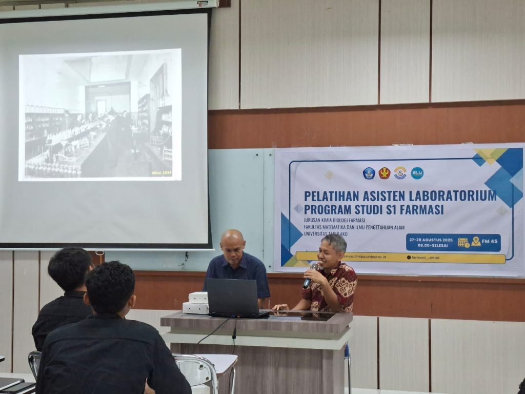 Program Studi Farmasi Universitas Tadulako kembali melaksanakan Pelatihan Asisten Laboratorium sebagai upaya membekali mahasiswa dengan kompetensi, keterampilan, serta etika dalam mendukung proses pembelajaran praktikum. Kegiatan ini dilakukan selama dua hari yaitu hari Rabu dan Kamis, 27 dan 28 Agustus 2025 serta diikuti oleh mahasiswa yang terpilih menjadi calon asisten laboratorium pada berbagai bidang ilmu di Prodi Farmasi.