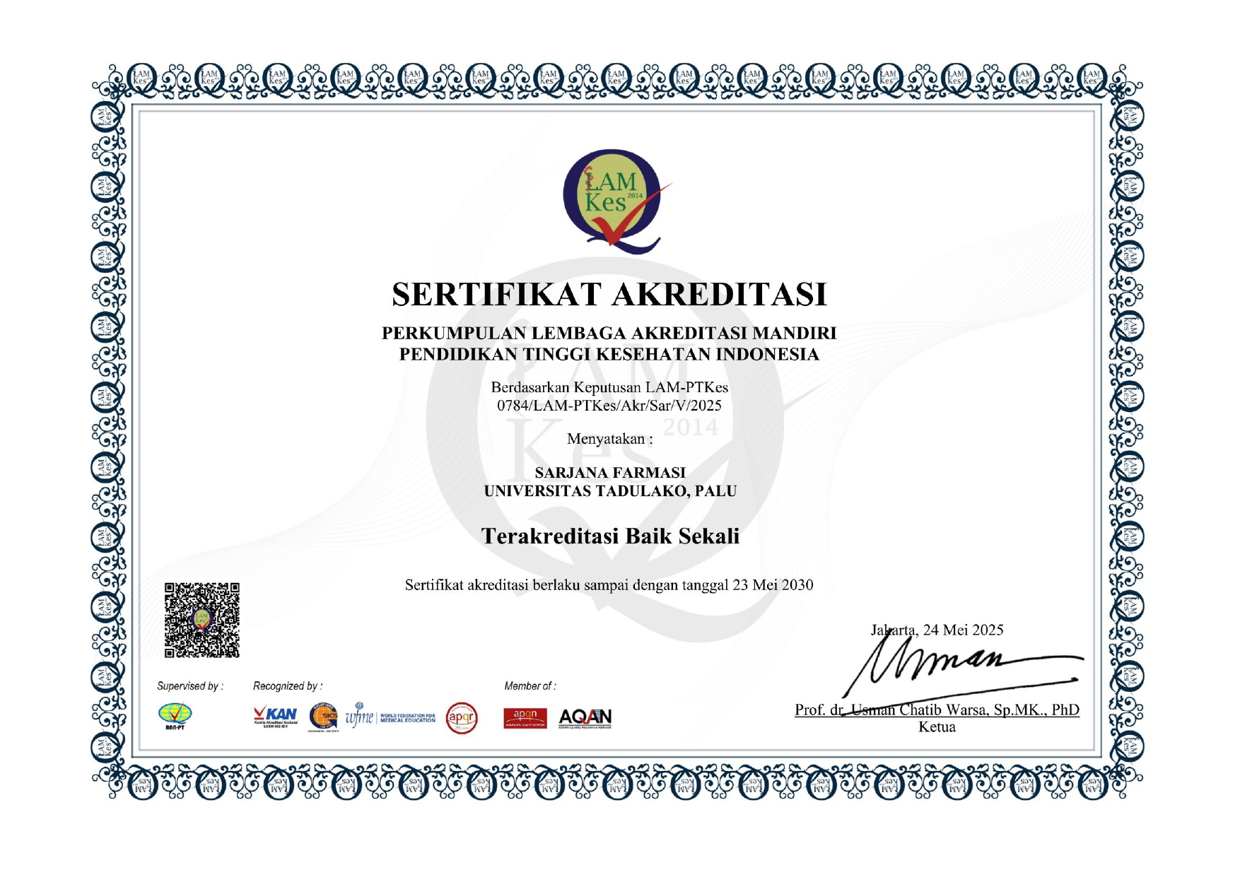 Perpanjangan Status Akreditasi Dan Peringkat Terakreditasi Tahun 2020 Berdasarkan Keputusan Perkumpulan LAM–PTKes no. 0026/LAM–PTKes/Akr.Perp/08.2020, program studi Sarjana Farmasi Fakultas Matematika dan Ilmu Pengetahuan Alam Universitas Tadulako terakreditasi dengan peringkat Akreditasi B.